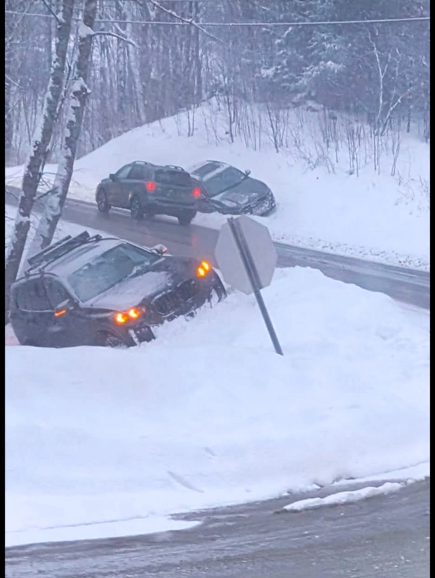 There is no Triple A here, just a local towing operation that makes the bulk of its income on the busy winter weekends. It’s a minimum $225 for a simple yank out of a ditch, and many of the aggressive drivers apparently believe that an expensive SUV with all wheel drive is not susceptible to sliding off the road. Thus this predictable situation is all too common: